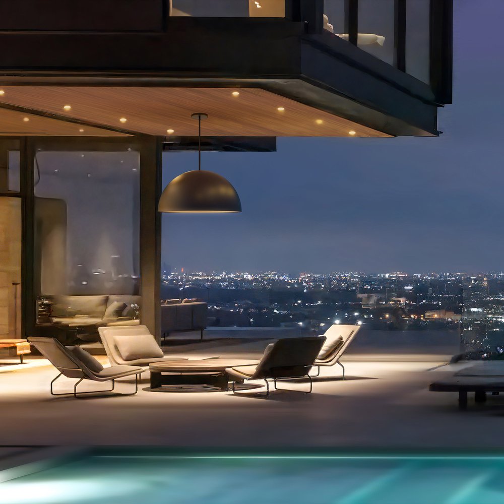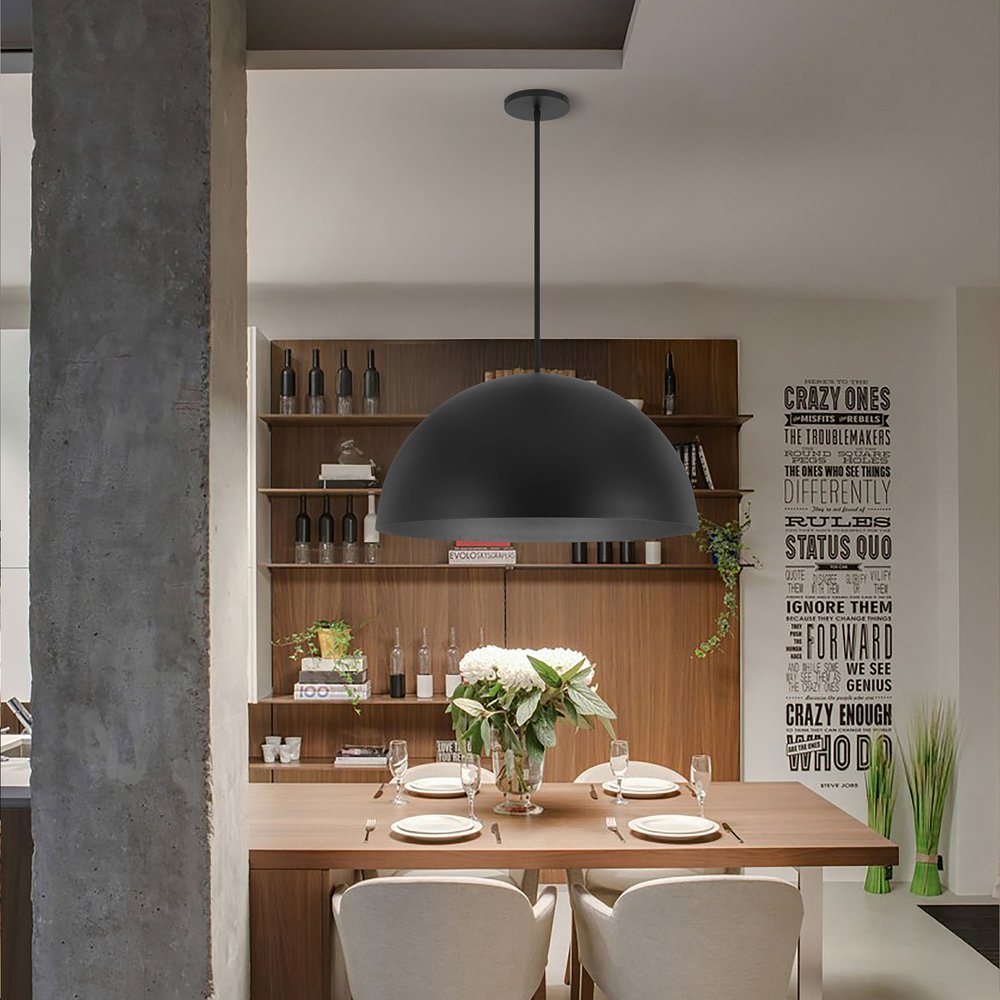 The 32-inch black aluminum dome LED dimmable outdoor pendant hanging light is a stylish addition to your outdoor living space. With its matte black finish and half round drum-shaped design, this light effortlessly complements transitional decor. Made from durable powder coated aluminum, it promises longevity while the frosted glass shade diffuses light beautifully. The integrated LED technology allows for efficient illumination, making it perfect for both indoor and outdoor settings. Dimmable functionality enhances ambiance, providing versatility for any occasion. Whether you're illuminating a patio or enhancing an indoor nook, this pendant light merges functionality with modern aesthetics. 15.88-inch h x 31.50-inch w x 31.50-inch d.
